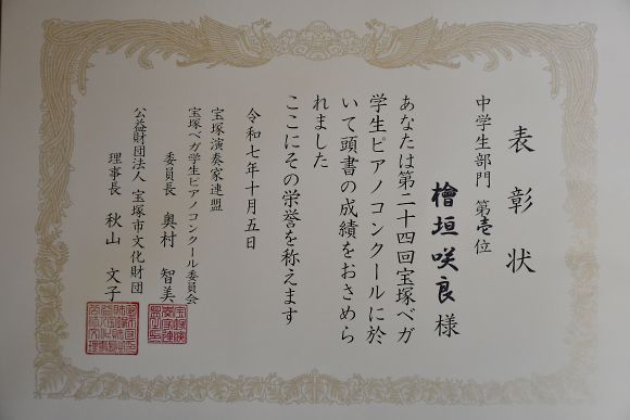 2025.10.5 ♫おめでとうございます。大阪信愛学院中学校2年 檜垣咲良さん!第24回宝塚ベガ学生ピアノコンクール 本選において優秀な成績をおさめ、第一位を受賞されました。 ...