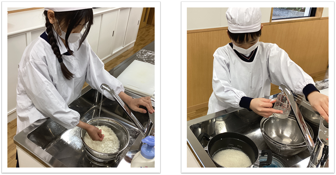 登校後、各グループの代表者が早めに登校し、お米とぎをしました。水の量をきっちりはかり、しばらく吸水させます。