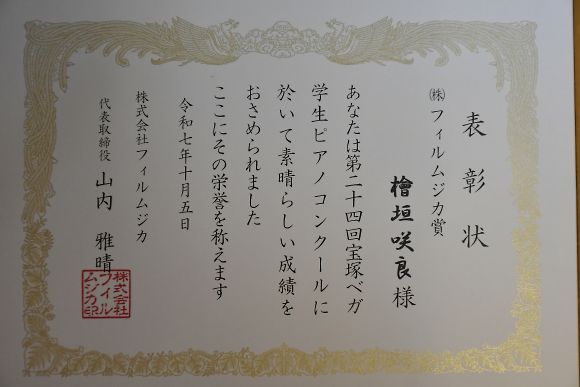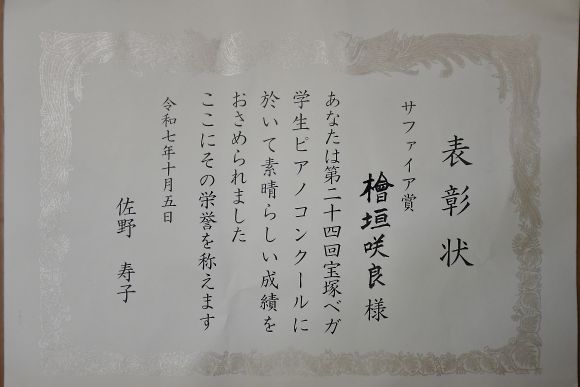特別活動 2025.10.13 入賞:おめでとう!学生ピアノコンクール第一位 2025.10.5 ♫おめでとうございます。大阪信愛学院中学校2年 檜垣咲良さん!第24回宝塚ベガ学生ピアノコンクール 本選において優秀な成績をおさめ、第一位を受賞されました。 第24回宝塚ベガ学生ピアノコンクール 本選プログラム! (株)フィルムジカ賞! サファイア賞! サファイア賞・副賞もいただきました。 おめでとうございました。 この記事をシェアする 特別活動TOPへ 学院ブログTOPへ