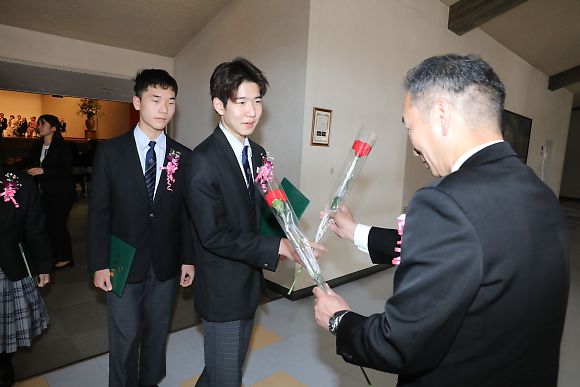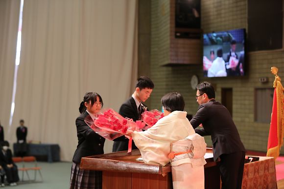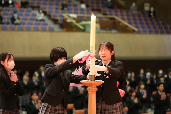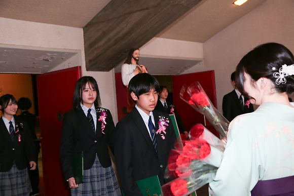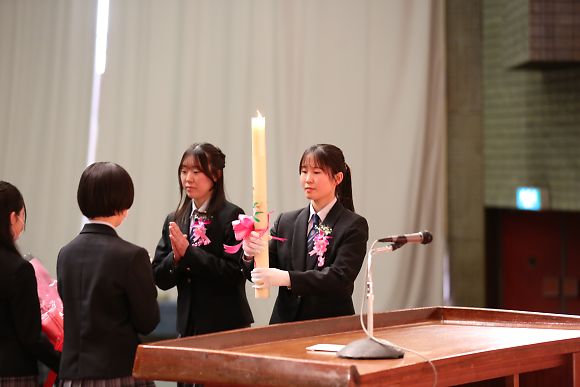 「学院の誇りある伝統をより美しいものに磨き上げ一段と光り輝くものに・・・」という願いを込めて、卒業生から在校生に渡されるともし火です。また在校生は卒業していく3年生にお祝いのしるしに花束を贈って今後の活躍を祈ります。