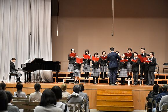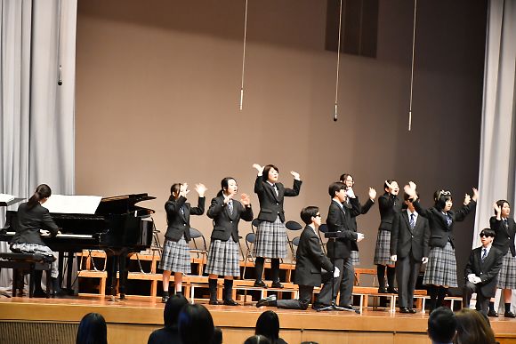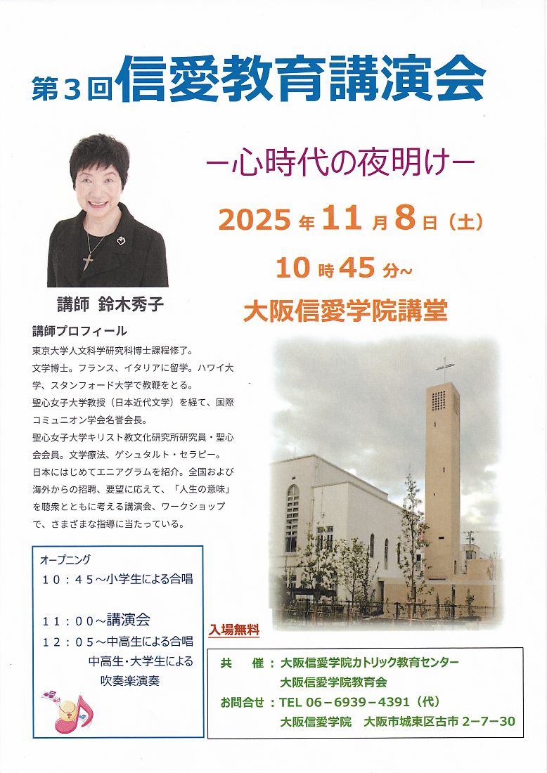 2025.11.8 大阪信愛学院「教育会」と「カトリック信愛教育センター」共催による第3回:信愛教育講演会が、今年は ”心時代の夜明け” をテーマにシスター鈴木秀子氏を講師にお迎えし学院講堂において開催されました。オープニングとして本学院 小学生による合唱が演奏され、続いて講演が始まりました。シスター鈴木秀子氏の講演終了後、本学院中学高等学校合唱部(昨年大阪府合唱コンクール 金賞受賞)による演奏が、続いて本学院中学高等学校吹奏楽部(昨年関西吹奏楽コンクール 銀賞受賞・全国大会出場)、本学院大学吹奏楽部による演奏が行われました。いずれも素晴らしい演奏でした。