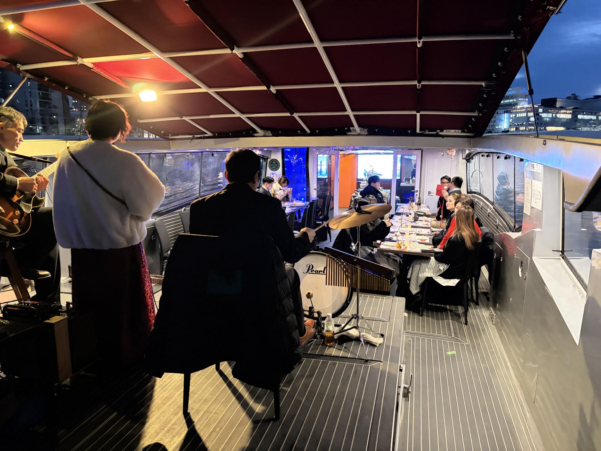 乗船したクルーズ船の作動音はほぼなく、ジャズの生演奏や会話、夜景を楽しみながらの2時間ほどのディナークルーズでした。