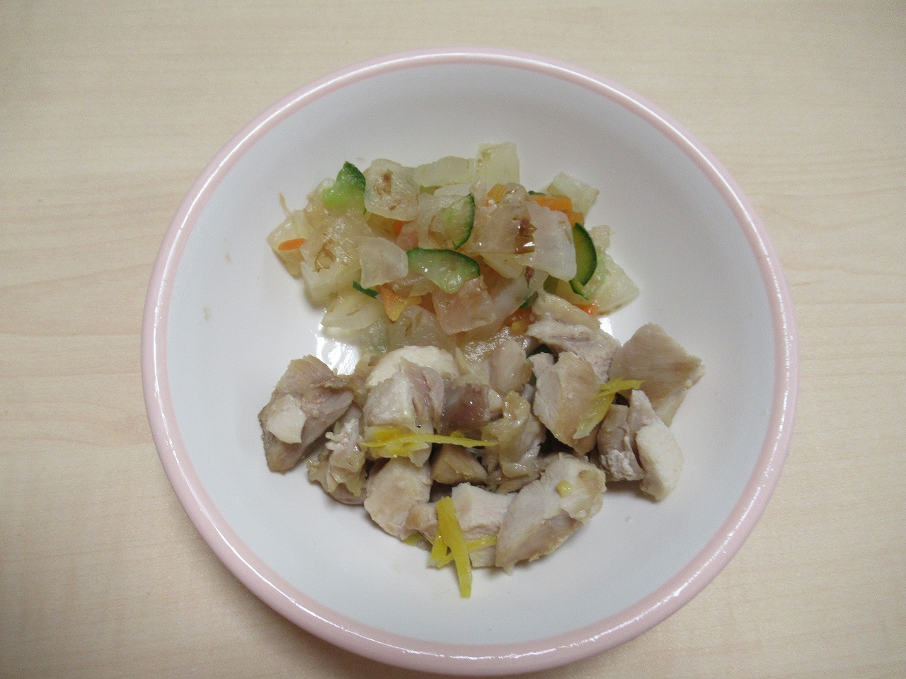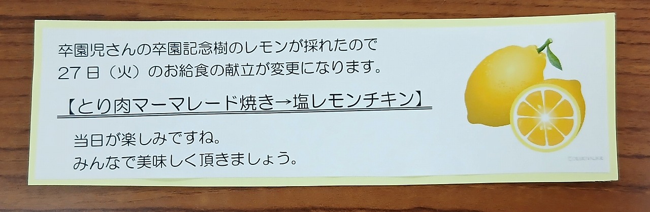 給食の先生に美味しい【塩レモンチキン】に調理してもらいました。子どもたちに人気の【鶏肉マーマレード焼き】と一味違ったすっきりとした味。みんなモリモリいただきました。