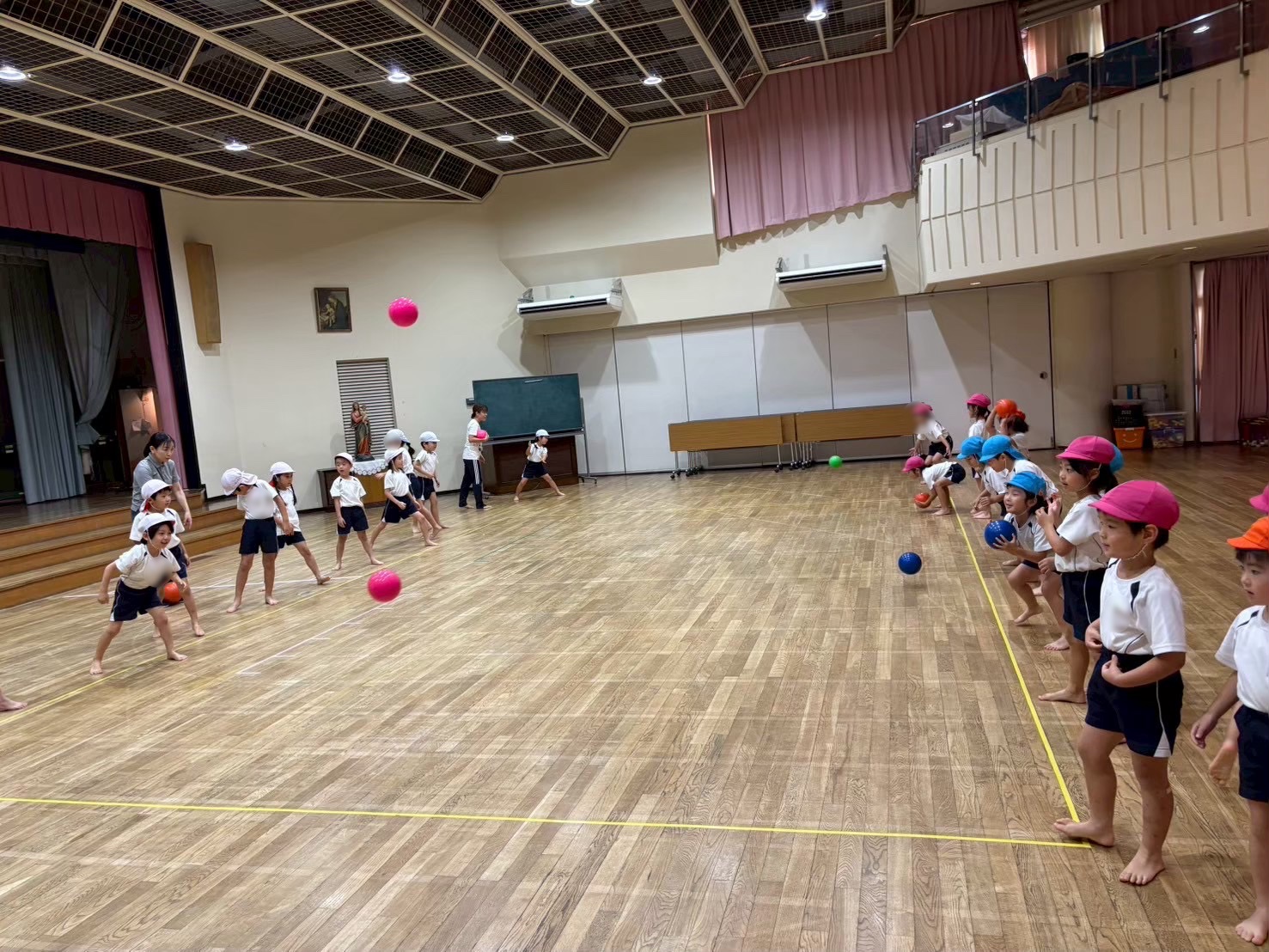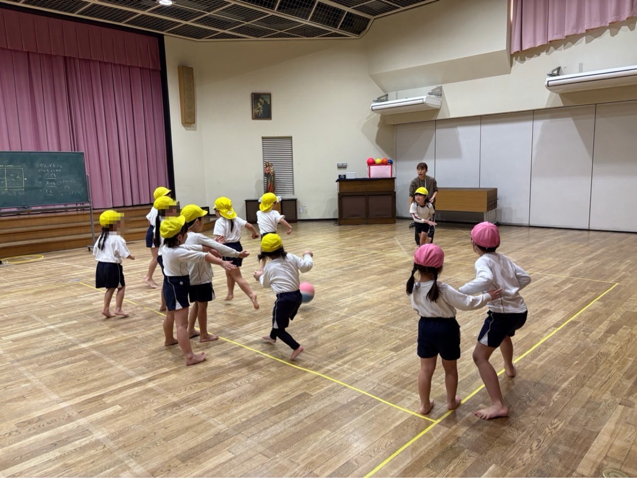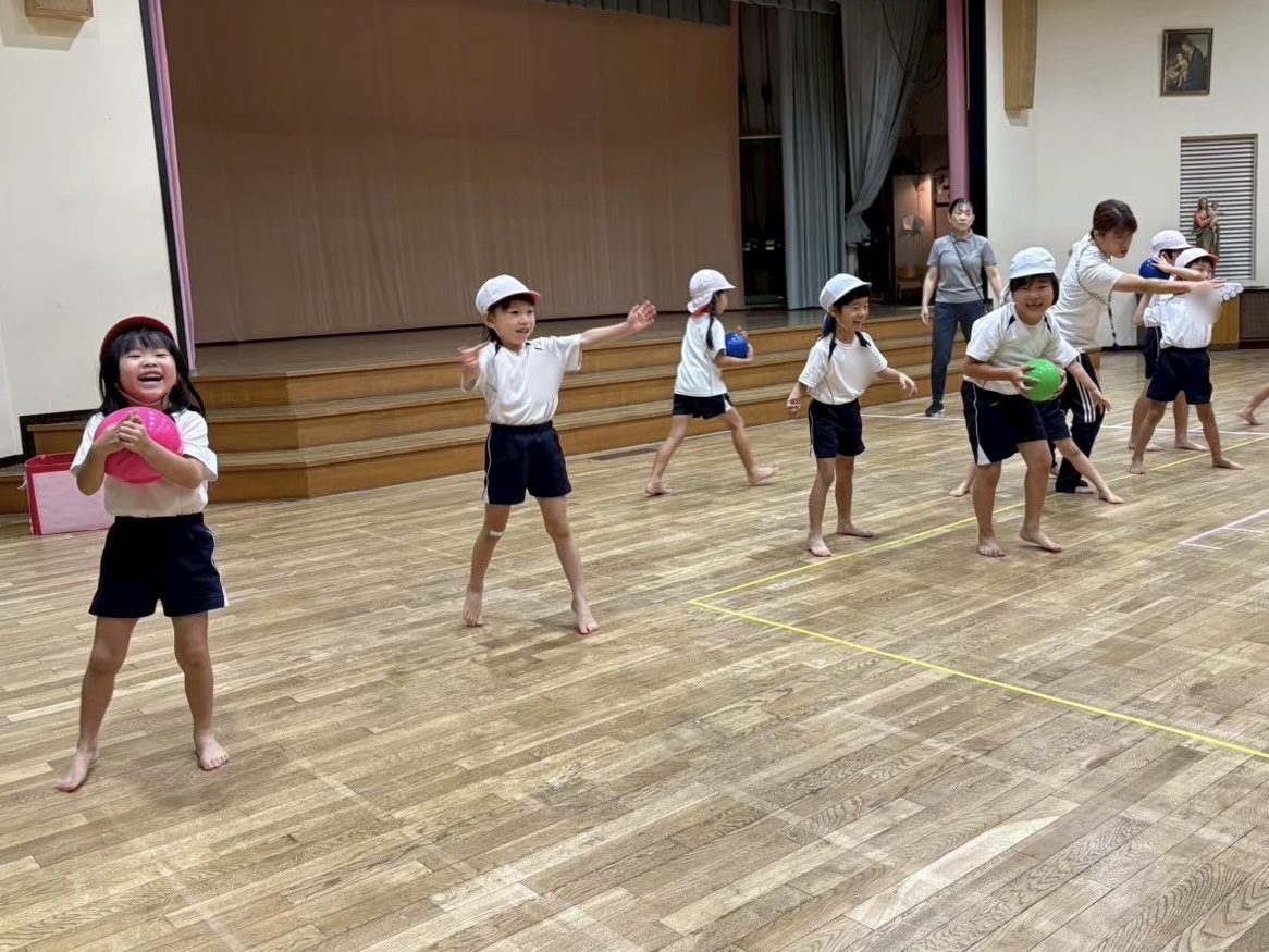 モンテッソーリ体育では、キャッチボールやドッジボールを通して、投げる・受けるといった基本的な動きを楽しみながら経験しました。