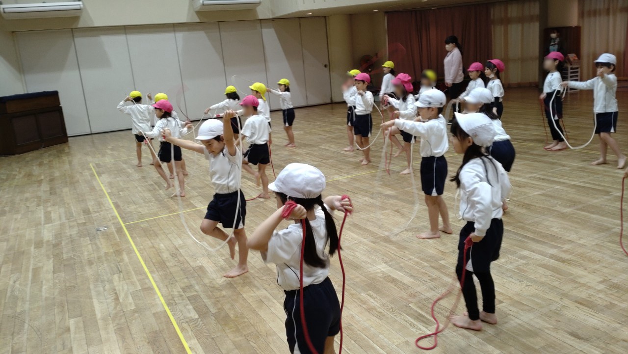 また、寒い季節に合わせて縄跳びを取り入れ、縄体操や前跳び、あやとびにも挑戦しました。繰り返し取り組むことで、「やってみたい」「もう一回挑戦したい」という意欲が高まり、一人ひとりが自分のペースで目標に向かって集中して取り組む姿が見られました。