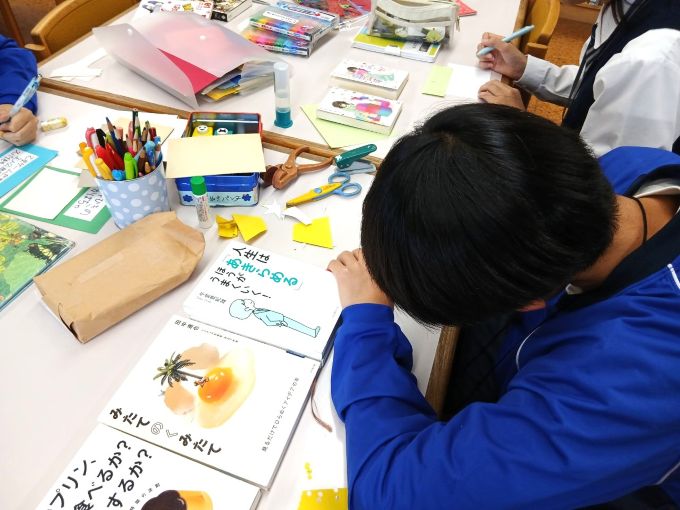 午後からは、各自が選んだ本を紹介するPOP作り、カウンター業務の体験、本の返却作業をしました。
