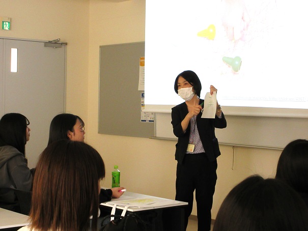 保育者や小学校の先生をめざす皆さんに「乳児期、幼児期の子どもってどんな絵を描くのかな?その絵をどのように見ていくと良いのだろう?」という観点で体験していただきました。