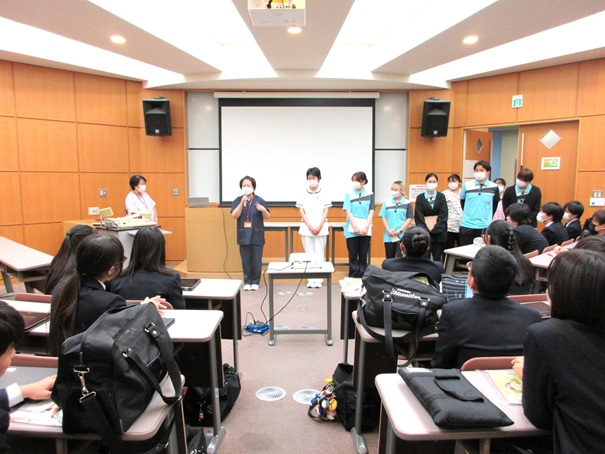 本学の教員や看護学部の学生とともに、大学説明、演習授業体験、キャンパス見学を実施し、中学校の皆さんの将来設計に役立ててもらう時間となりました。