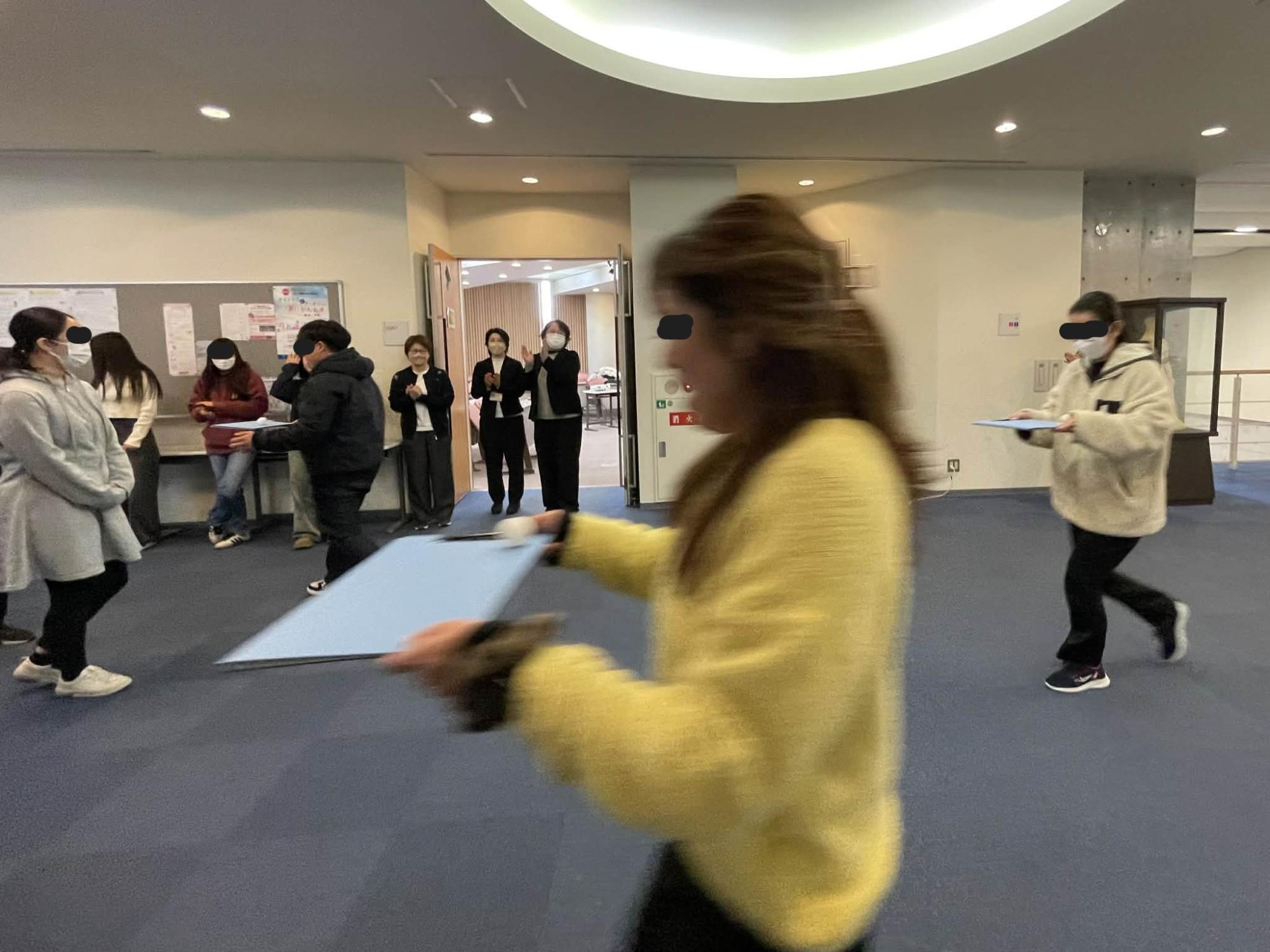 後半のプログラムでは、アイスブレイクとして「ピンポン玉運びゲーム!」を実施し、入学予定者チームと保護者チームに分かれて競争しました。優勝チームには、ささやかな景品も贈呈され、保護者の皆さまも真剣に取り組んでくださり、大いに盛り上がりました。