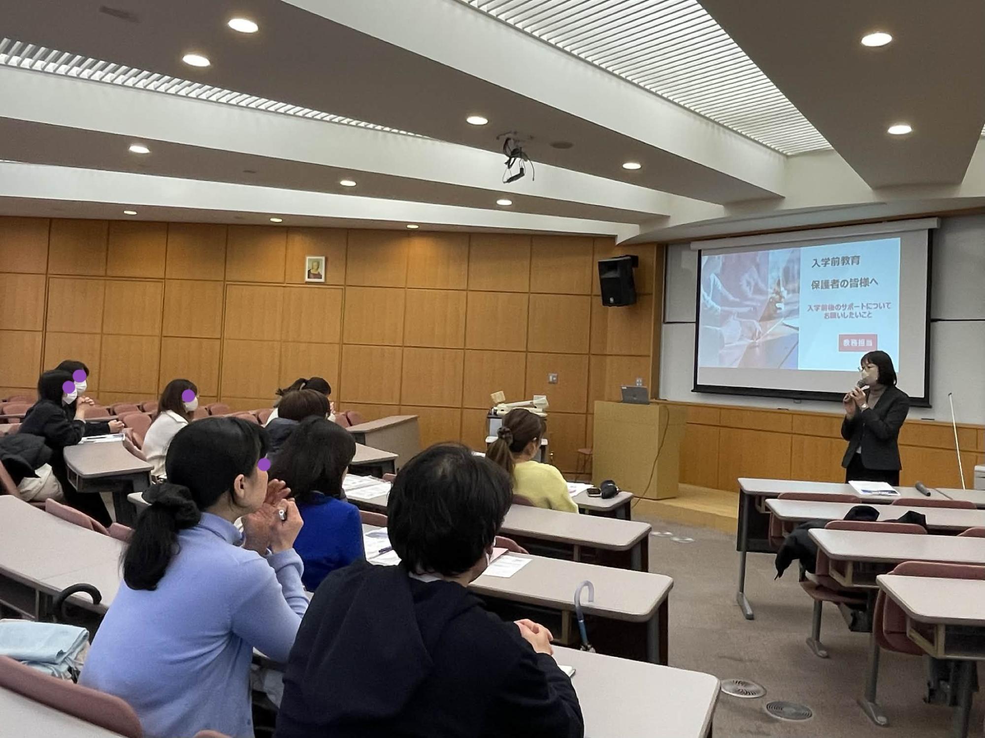 入学予定者がテストに取り組んでいる間、保護者向けプログラムも並行して実施しました。教務委員会、国家試験対策委員会、キャリア支援委員会より、本学の取り組みや現状について説明した後、質疑応答の時間を設けました。入学が近づいていることもあり、保護者の皆さまからは多くの質問が寄せられました。